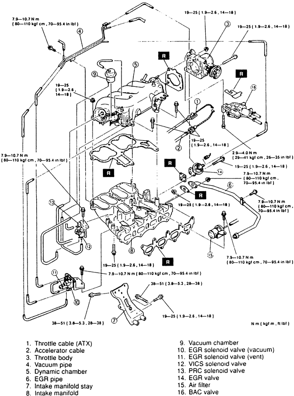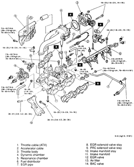 | Fig. 5: Exploded view of the intake manifold, illustrating the removal and installation components with tightening values-1.8L (FP) engine |