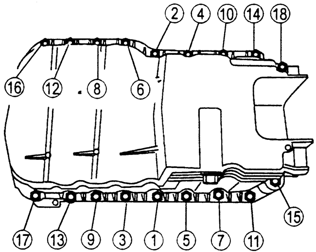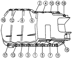 | Fig. 1: Tighten the oil pan bolts in sequence 2.3L–2.5L engines |