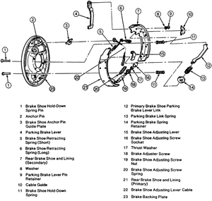 | Fig. 2: Exploded view of the rear brake shoes and components — 1998–01 B-Series Pick-Up |