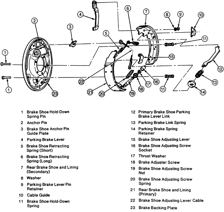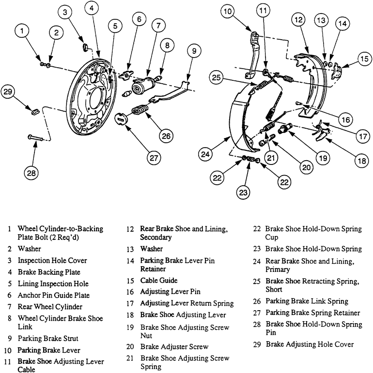| Fig. 1: Exploded view of the rear brake shoes and components — 1997 B-Series Pick-Up |