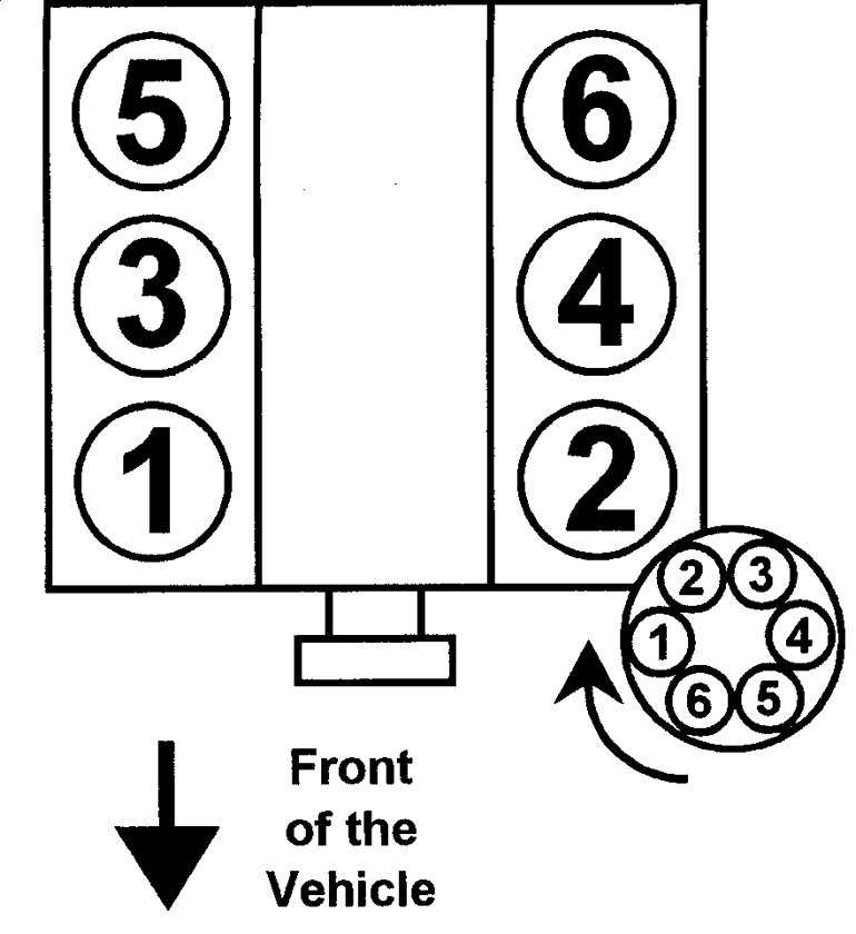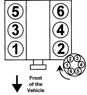 | Fig. 3: 1997–98 3.0L engine Firing order: 1–2–3–4–5–6 Distributor rotation: Clockwise |