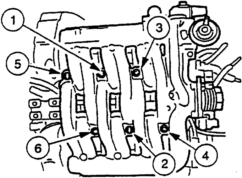 | Fig. 10: Tighten the upper manifold bolts in the sequence shown — 2.3L engine |