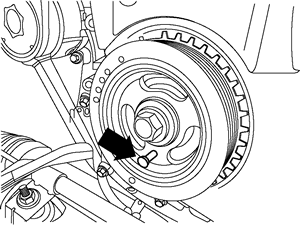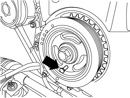 - Install the crankshaft timing peg (303-507) and turn the crankshaft pulley bolt to position the number one cylinder at top dead center.