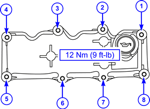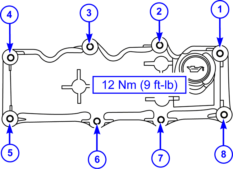 - Install the valve cover by positioning the valve cover then tightening the 8 bolts in the sequence shown below.