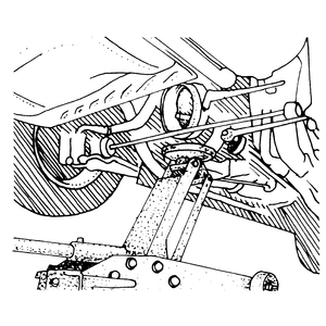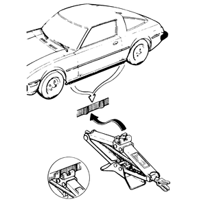 Vehicles covered by this manual were factory-equipped with a scissors jack. This jack is used by positioning it under a jacking point on the side sill, then turning the screw to raise/lower the vehicle. Specific instructions for the use of this jack, including the jacking points, are found in the owner's manual (and often on stickers attached to the jack or in the luggage compartment). Although this type of jack is suitable for tire changing, you might need a better jack for maintenance.