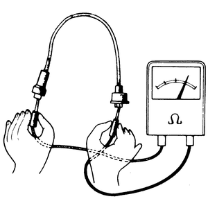 | Fig. 1: Checking spark plug cable resistance with an