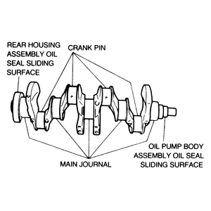 In addition, on 1983–87 2.0L engines, you must measure the front and rear oil seal sliding surface diameters. The rear seal surface must measure 3.5412–3.5434 in. (89.9–90.0mm). The front oil pump body assembly seal surface must measure 1.3371–1.3386 in. (33.96–34.00mm). Both must also be within the elliptical limit described above.