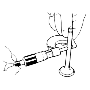 Remove all carbon from the valves and inspect for warpage, cracks, or excessive burning. Replace valves that cannot be cleaned up and refaced without removal of an excessive amount of metal. Measure the stem diameter at three places using a micrometer, and note the smallest figure. Then, determine the inner diameter of the corresponding valve guide, using a dial indicator at two positions. (First, take one reading at an arbitrary point, then rotate the indicator 90 degrees to obtain the second reading.) Note the larger figure. You can then calculate the stem-to-guide clearance by subtracting the stem diameter from the valve guide's inner diameter.