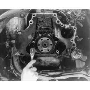 - Unfasten the rear main seal cover retaining bolts and remove the cover.