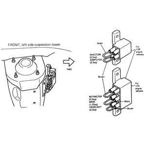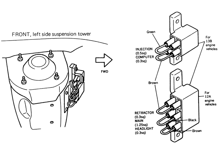 The fusible links used on the RX-7 are of the plug-in type and are found only on 1979–85 models. The main bank of fusible links is located inside the engine compartment on the left-side fender near the front suspension tower. There are also two fusible links located near the steering column under the dashboard.