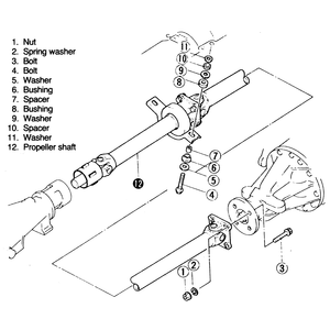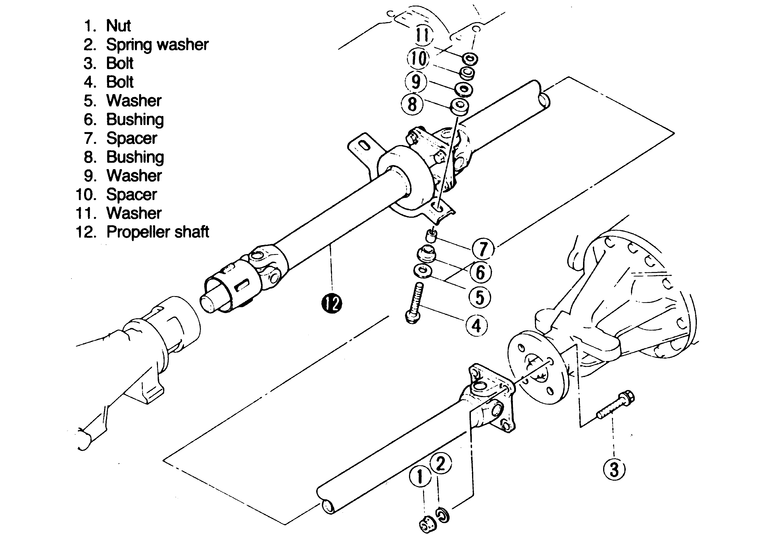 - Remove the bolts, washers, bushings and spacers that secure the center bearing