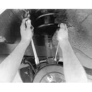 - Remove the rear wheels. Disconnect the flexible brake hose from the strut.