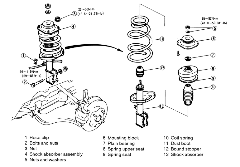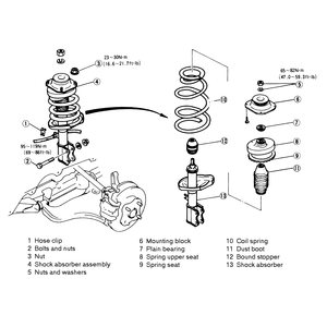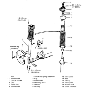 | Fig. 2: Exploded view of a front strut — 1983–89 626 |