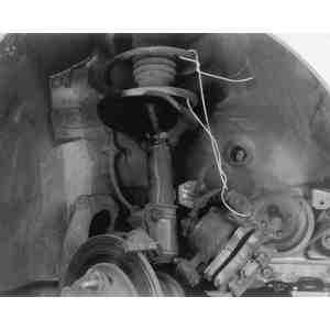 - Disconnect the horseshoe clip retaining the brake hose to the front strut.