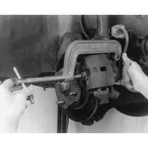 - Using a large C-clamp, depress the caliper piston until it bottoms in its