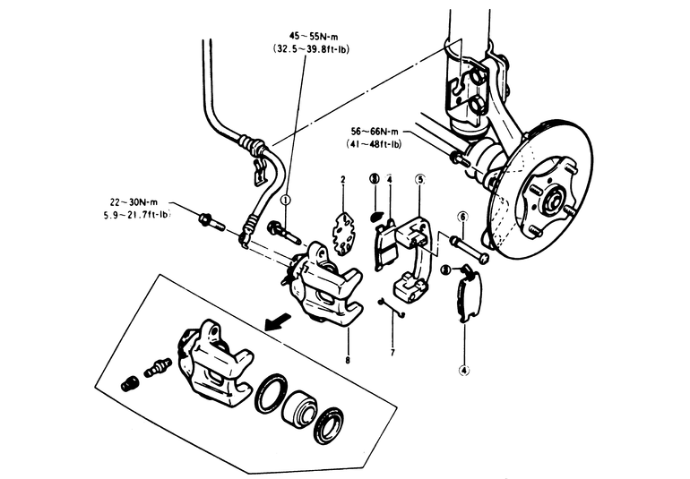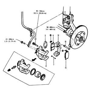 and lower caliper bolts to 29–36 ft. lbs (39–49 Nm). On 1988–89