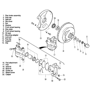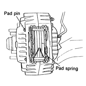 - Remove the clip, pad pins and pad spring. Remove the brake pads.