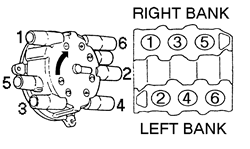 | Fig. 4: 1993-94 929 3.0L, (JE-ZE) EngineEngine Firing Order: 1-2-3-4-5-6Distributor Rotation: Clockwise |