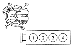 | Fig. 1: 4-cylinder except 626, MX6 2.0L (FS) and Miata 1.6L (B6E) and 1.8L (BPD) Engine Firing Order: 1-3-4-2Distributor Rotation: Counterclockwise |