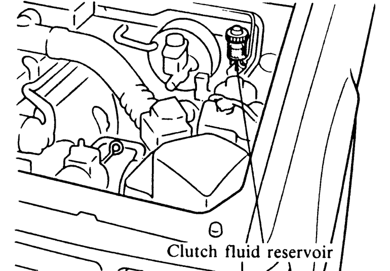 The clutch master cylinder is located at the left rear corner of the engine compartment. Check the level in the clutch master cylinder in the same manner as the brake master cylinder. The level should be kept at the MAX. mark or approximately 1/4 in. from the top of the cylinder. Use brake fluid in the clutch system. Be sure that the vehicle is on a level surface.