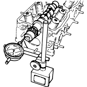 - Push the camshaft toward the rear of the engine. Install a dial indicator