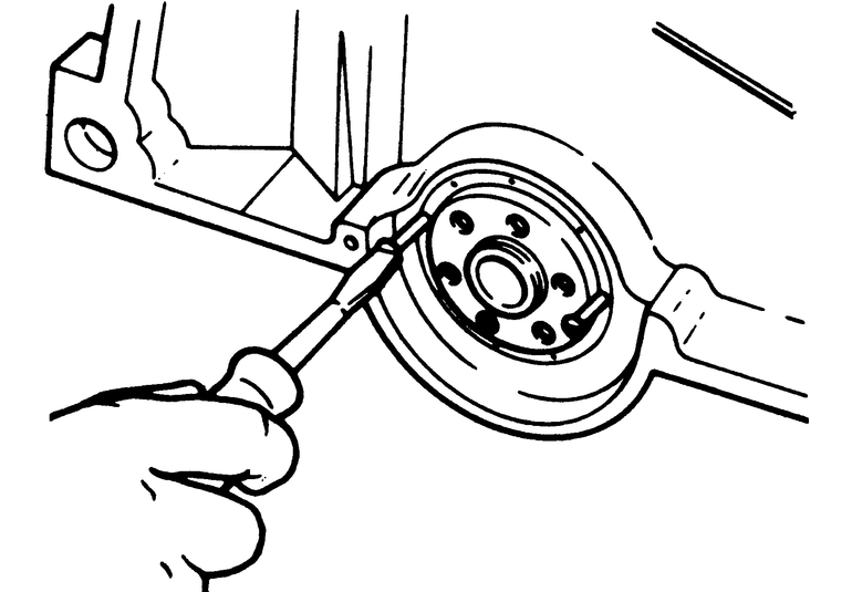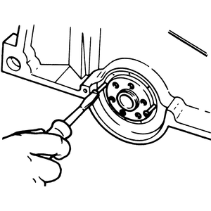 - Remove the flywheel attaching bolts and remove the flywheel and engine rear