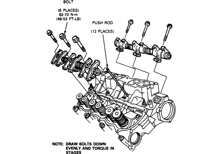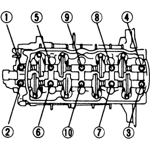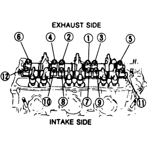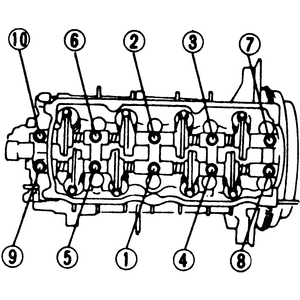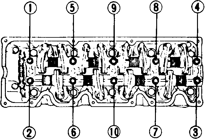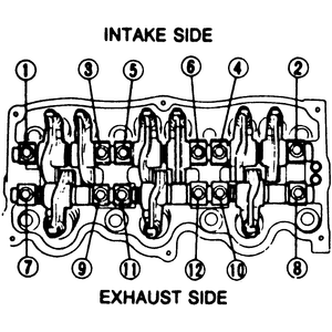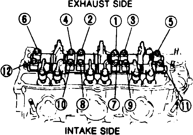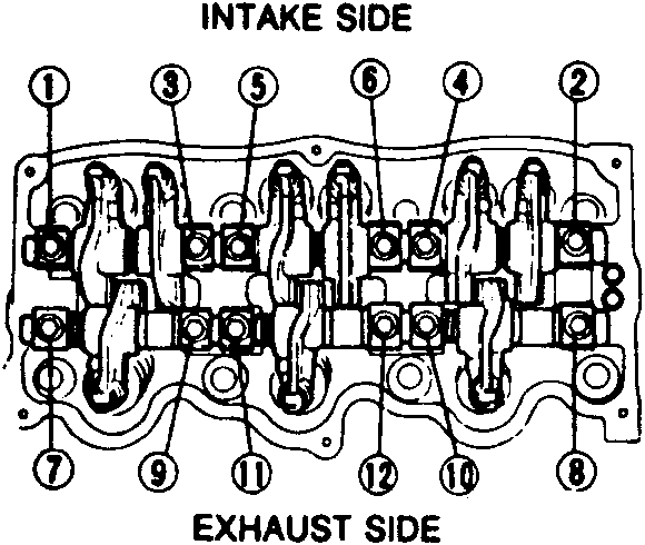 | Fig. 3: Rocker arm/shaft assembly mounting bolt tightening sequence |
