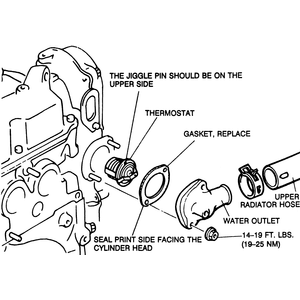 NOTE: If the replacement thermostat is equipped with a jiggle pin, the pin must be install facing upwards toward the top of the engine (12 o'clock), and should be on the side facing the water outlet. When installing the thermostat gasket, the seal print side should face the cylinder head.