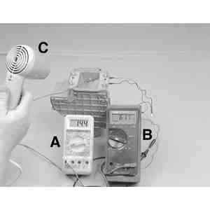 an ohmmeter (B) and a hairdryer (C), measure the resistance fluctuation