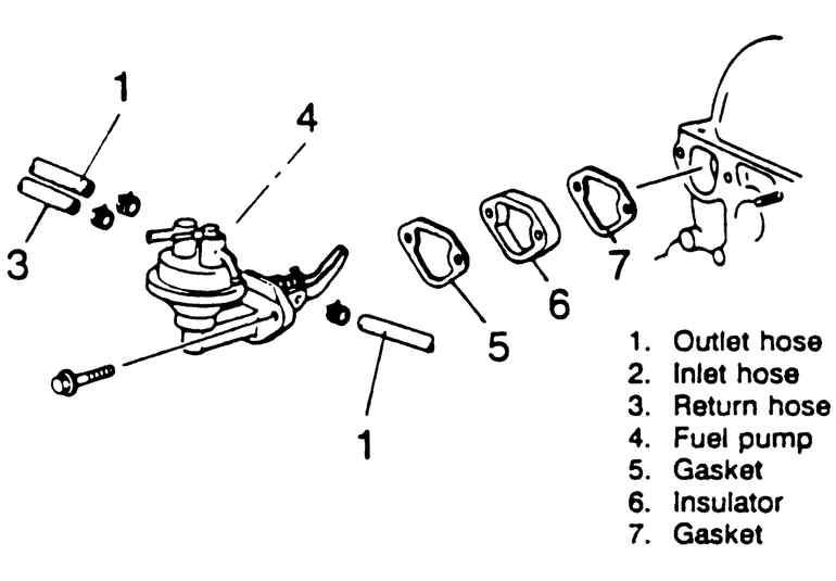 Install new gaskets and the insulator and fuel pump. Install the mounting bolts and tighten to 14–19 ft. lbs. (19–25 Nm).