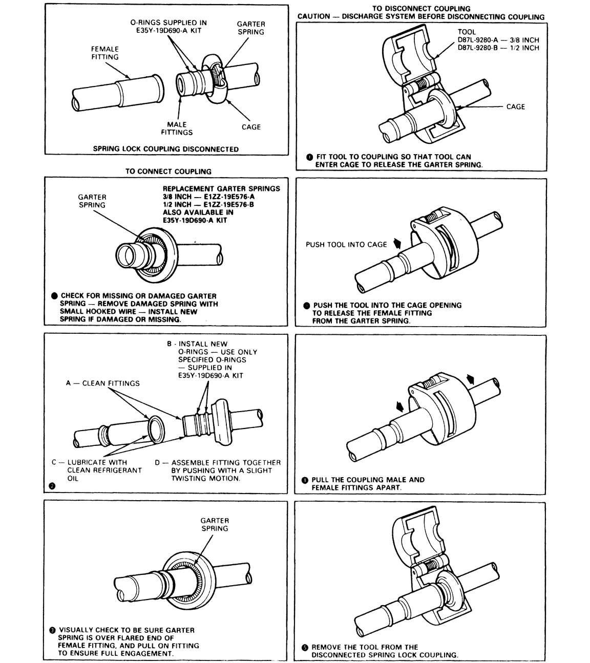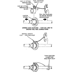 The spring lock coupling is held together by a garter spring inside a circular cage. When the coupling is connected together, the flared end of the female fitting slips behind the garter spring inside the cage of the male fitting. The garter spring and cage then prevent the flared end of the female fitting from pulling out of the cage. As an additional locking feature, most vehicles have a horseshoe-shaped retaining clip that improves the retaining reliability of the spring lock coupling.