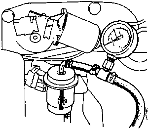 Disconnect the fuel line from the fuel filter outlet. Connect a fuel pressure gauge to the fuel filter outlet.