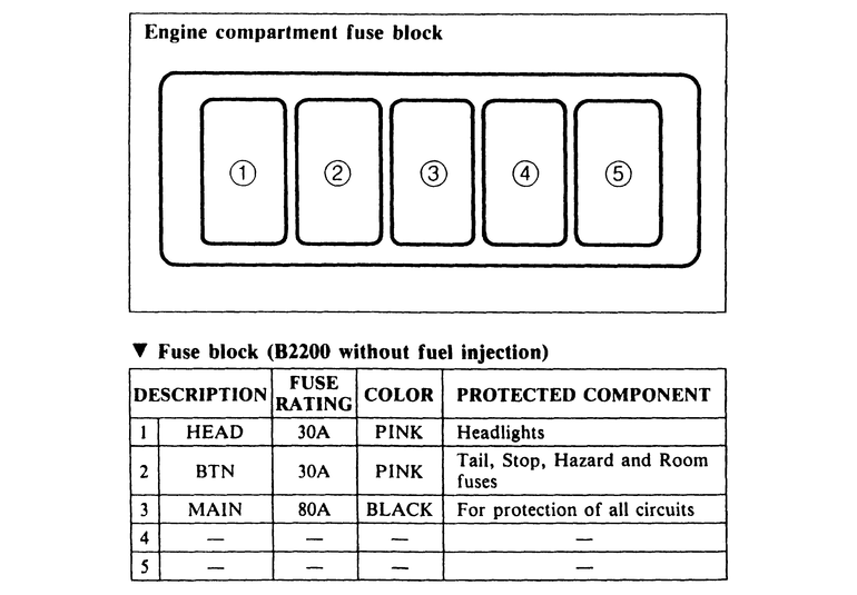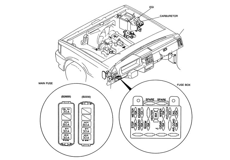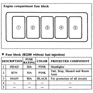 | Fig. 9: Underhood power distribution box and identification chart for the B Series Pickup with 2.2L carbureted engine |