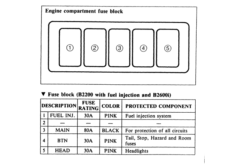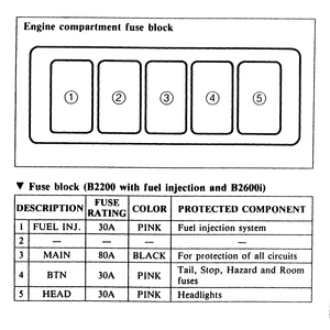 | Fig. 10: Underhood power distribution box and identification chart for the B Series Pickup with fuel injected engines |