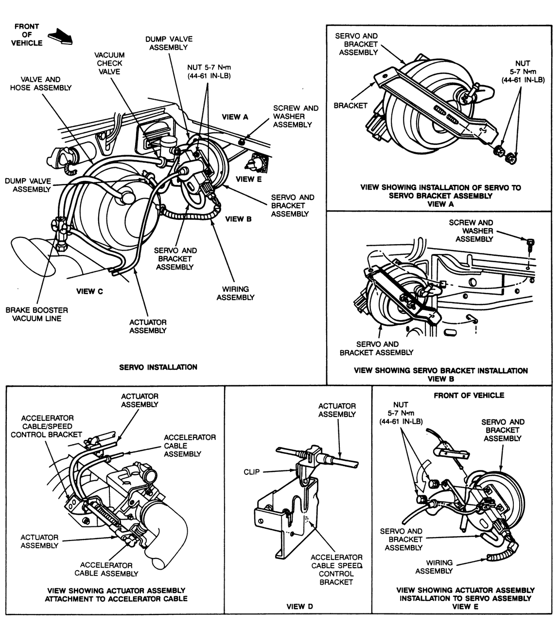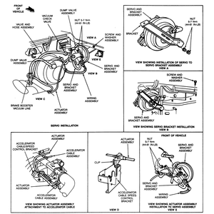 The throttle actuator is mounted in the engine compartment and is connected to the throttle linkage with an actuator cable. The speed control amplifier regulates the throttle actuator to keep the requested speed. When the brake pedal is depressed, an electrical signal from the stoplamp switch returns the system to stand-by mode. The vacuum dump valve also mechanically releases the vacuum in the throttle actuator, thus releasing the throttle independently of the amplifier control. This feature is used as a safety backup.