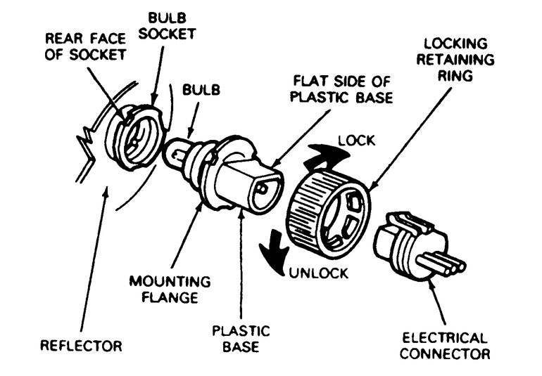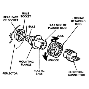 - Unfasten the locking ring which secures the bulb and wire harness plug