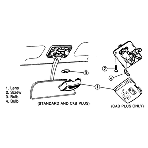 The Navajo has a cargo light mounted on the roof headliner near the tailgate, the MPV has a cargo light located on the liftgate door and the Cab Plus Pickup model has an additional passenger area lamp mounted on the headliner toward the rear. To replace the bulbs, simply pry off the lens and pull out the bulb. Install the new bulb.