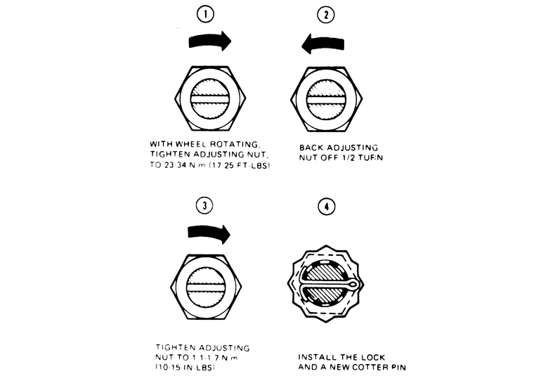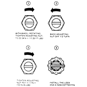 - While rotating the wheel assembly, tighten the adjusting nut to 17–25