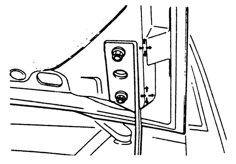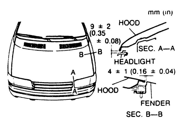 On self-supporting hoods, alignment can be adjusted front-to-rear or side-to-side by loosening the hood-to-hinge or hinge-to-body bolts. The front edge of the hood can be adjusted for closing height by adding or deleting shims under the hinges. The rear edge of the hood can be adjusted for closing height by raising or lowering the rear hood bumpers.