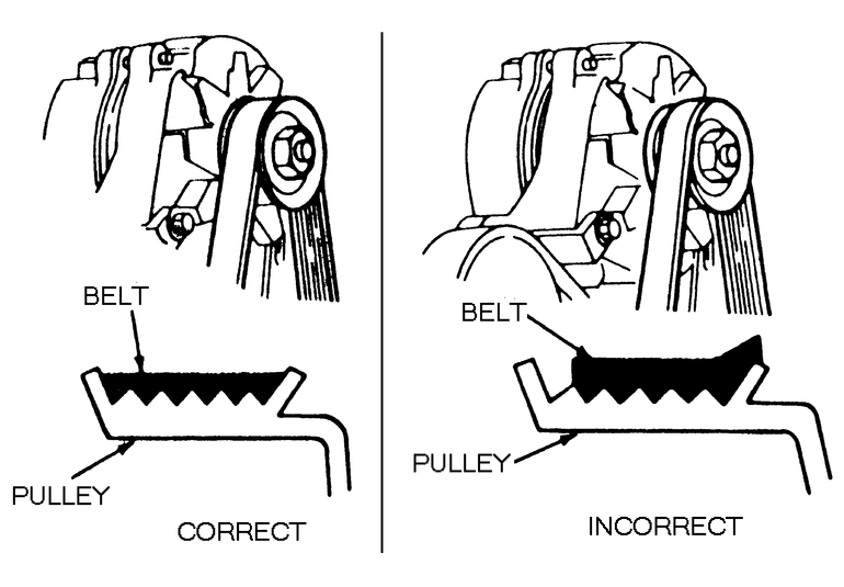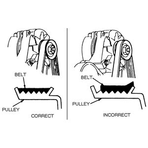 Belt tension can be checked by pressing on the belt at the center point of its longest straight run. The belt should give about 1⁄4 – 1⁄2 in. If the belt is loose, it will slip. If the belt is too tight it will damage bearings in the driven unit. Those units being driven, such as the alternator, power steering pump or compressor, have a bolt which when loosened allows the unit to move for belt adjustment. Sometimes it is necessary to loosen the pivot bolt also, to make the adjustment.