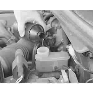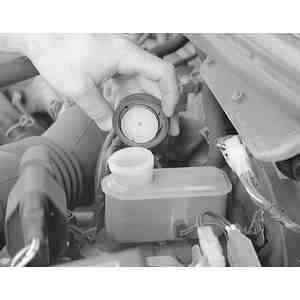 If it becomes necessary to add fluid to the system, take a moment to clean the area around the cap and reservoir. Use a clean rag to wipe away dust and dirt which could enter the reservoir after the cover is removed. If the level of the brake fluid is less than half the volume of the reservoir (and the brake pads are not approaching a replacement point), it is advised that you check the brake system for leaks. Leaks in the hydraulic system often occur at the wheel cylinders.
