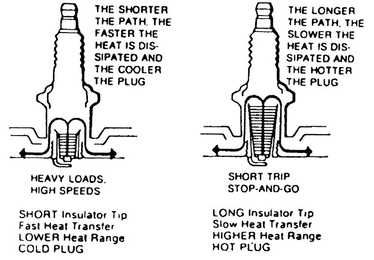 Spark plug heat range is the ability of the plug to dissipate heat. The longer the insulator (or the farther it extends into the engine), the hotter the plug will operate; the shorter the insulator (the closer the electrode is to the block's cooling passages) the cooler it will operate. A plug that absorbs little heat and remains too cool will quickly accumulate deposits of oil and carbon since it is not hot enough to burn them off. This leads to plug fouling and consequently to misfiring. A plug that absorbs too much heat will have no deposits but, due to the excessive heat, the electrodes will burn away quickly and might possibly lead to preignition or other ignition problems. Preignition takes place when plug tips get so hot that they glow sufficiently to ignite the air/fuel mixture before the actual spark occurs. This early ignition will usually cause a pinging during low speeds and heavy loads.