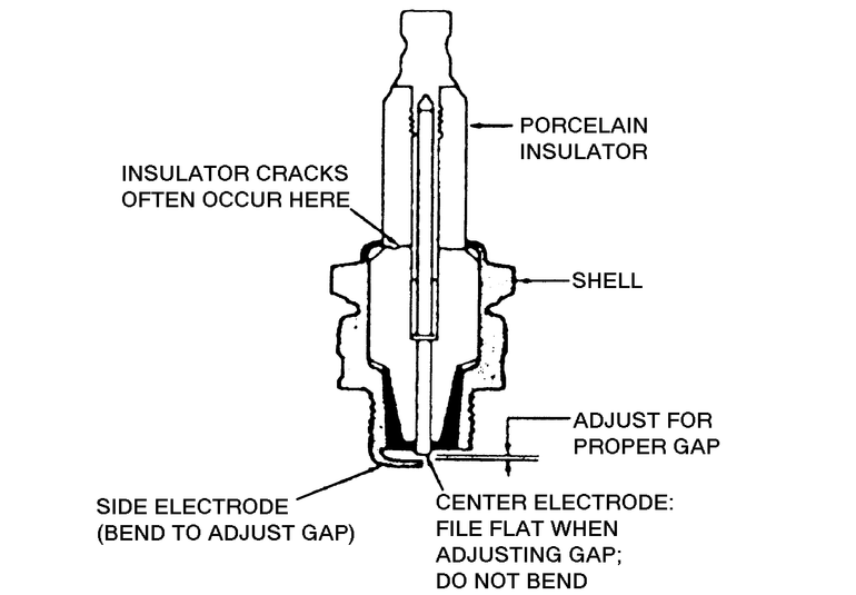 A typical spark plug consists of a metal shell surrounding a ceramic insulator. A metal electrode extends downward through the center of the insulator and protrudes a small distance. Located at the end of the plug and attached to the side of the outer metal shell is the side electrode. The side electrode bends in at a 90( angle so that its tip is just past and parallel to the tip of the center electrode. The distance between these two electrodes (measured in thousandths of an inch or hundredths of a millimeter) is called the spark plug gap.