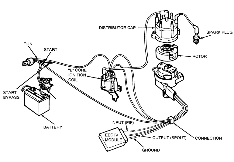 This electronic ignition is a Thick Film Integrated (TFI) ignition system. The TFI module is also known as the Ignition Control Module (ICM) which reports engine position and rpm to the PCM. The PCM then determines the proper spark timing and advance, and returns a reference signal to tell the TFI module to switch the coil, thereby by creating a spark.