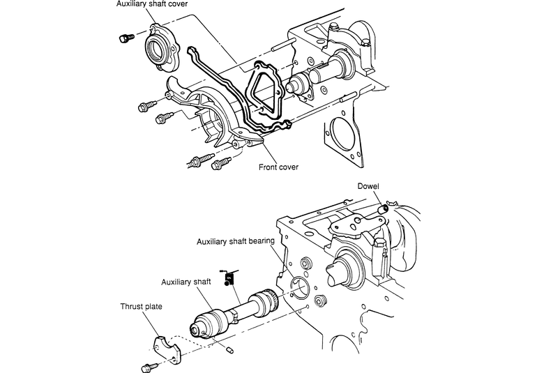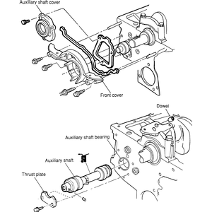 NOTE: The auxiliary shaft cover and cylinder front cover share a gasket. Cut off the old gasket around the cylinder cover and use half of the new gasket on the auxiliary shaft cover.