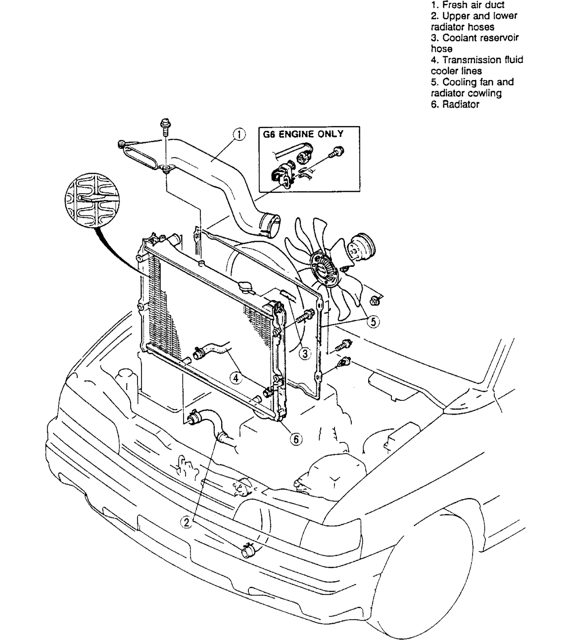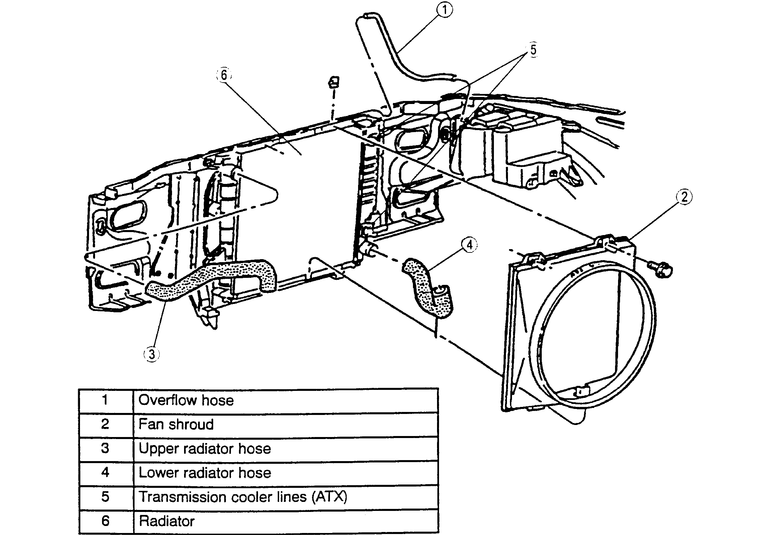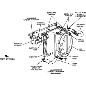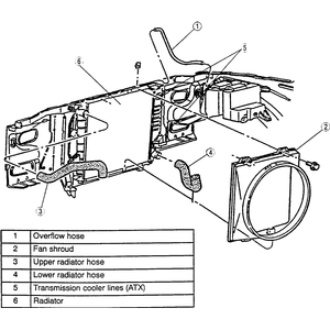 | Fig. 3: Exploded view of the 2.3L/2.5L radiator and related components; 3.0L and 4.0L engines similar |