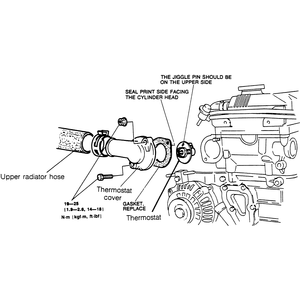 NOTE: If the replacement thermostat is equipped with a &inch;jiggle pin&inch;, the pin must be install facing upwards toward the top of the engine (12 o'clock), and should be on the side facing the water outlet. When installing the thermostat gasket, the seal print side should face the cylinder head.