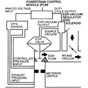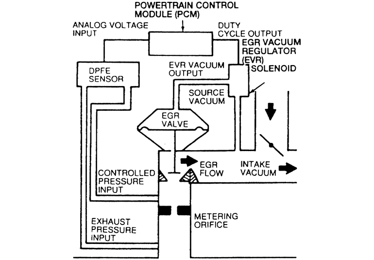 The EGR system is a Pressure Feedback EGR (PFE) or Differential PFE (DPFE) system, controlled by the Powertrain Control Module (PCM) and composed of the following components: PFE or DPFE sensor (also referred to as the backpressure transducer), EGR Vacuum Regulator (EVR) solenoid, EGR valve, and assorted hoses and tubing.