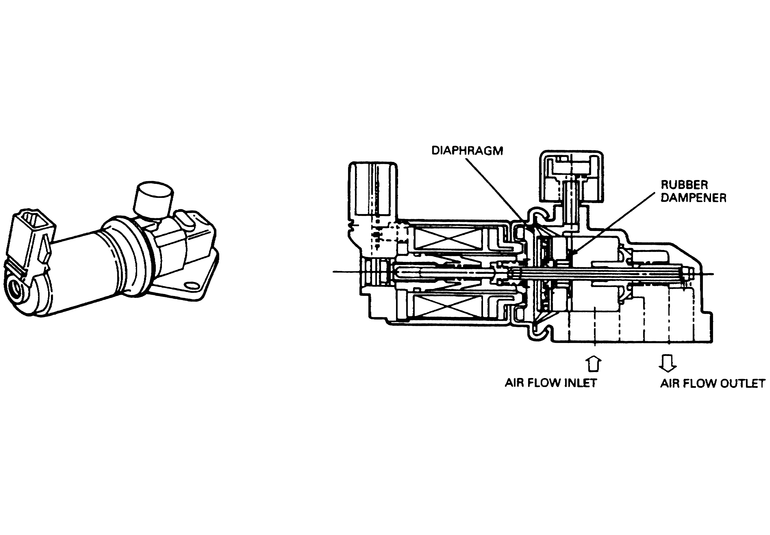 Fig. 1: Typical Idle Air Control (IAC) valve which is mounted to the throttle body — cutaway view shows air bypass direction