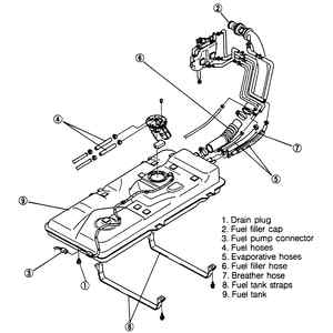 - Support the tank with a jack. Remove the retaining bolts and the fuel tank